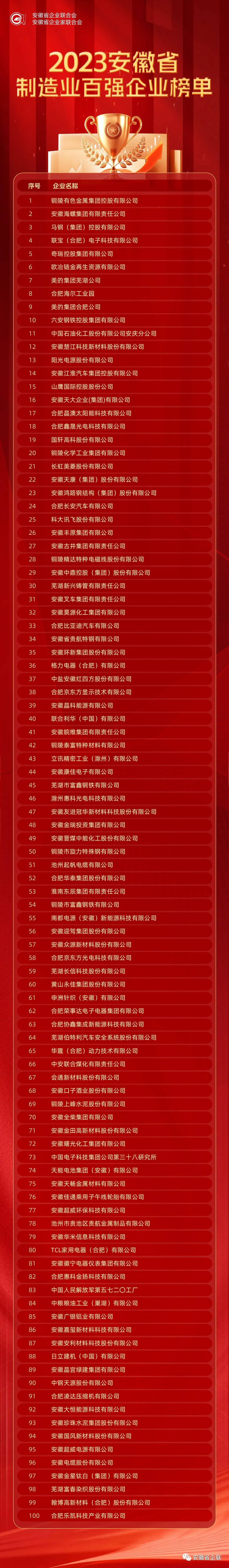 為全面貫徹習(xí)近平新時(shí)代中國特色社會(huì)主義思想和黨的二十大精神,著力推動(dòng)我省企業(yè)高質(zhì)量發(fā)展,促進(jìn)企業(yè)做強(qiáng)做優(yōu)做大,并為社會(huì)各界提供安徽大企業(yè)發(fā)展的數(shù)據(jù)信息,今年,我會(huì)連續(xù)第十九次在全省開展了安徽企業(yè)100強(qiáng)申報(bào)排序活動(dòng)。根據(jù)企業(yè)自愿申報(bào),有關(guān)機(jī)構(gòu)確認(rèn),以2022年企業(yè)營(yíng)業(yè)收入為標(biāo)準(zhǔn),經(jīng)審定,確定了安徽企業(yè)綜合100強(qiáng)和制造業(yè)、服務(wù)業(yè)企業(yè)100強(qiáng)。現(xiàn)將名單予以公布(詳見附件)。2022年,面對(duì)風(fēng)高浪急的國際環(huán)境和艱巨繁重的發(fā)展穩(wěn)定任務(wù),安徽大企業(yè)迎難而上,全面落實(shí)疫情要防住、經(jīng)濟(jì)要穩(wěn)住、發(fā)展要安全的要求,實(shí)現(xiàn)了企業(yè)運(yùn)行平穩(wěn)、質(zhì)量穩(wěn)步提升、社會(huì)貢獻(xiàn)度持續(xù)增長(zhǎng),取得了來之不易的新成就。安徽百強(qiáng)企業(yè)入圍門檻繼續(xù)提升,經(jīng)營(yíng)規(guī)??焖僭鲩L(zhǎng),國際化經(jīng)營(yíng)成效顯著,資產(chǎn)總額首次突破4萬億元,進(jìn)一步鞏固了大企業(yè)在市場(chǎng)競(jìng)爭(zhēng)中的領(lǐng)先地位。希望安徽百強(qiáng)企業(yè)認(rèn)真貫徹落實(shí)黨的二十大精神,立足中國式現(xiàn)代化全局謀劃自身發(fā)展,積極投身我省“三地一區(qū)”和“七個(gè)強(qiáng)省”建設(shè),堅(jiān)持高質(zhì)量發(fā)展方向,著力提升核心競(jìng)爭(zhēng)力,為建設(shè)現(xiàn)代化美好安徽做出更大的貢獻(xiàn)。
