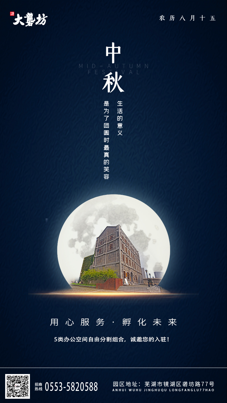 又是一年中秋時,又是一年團圓日。想必又是一次美好的“小長假”。在此,大礱坊科技文化園向各位企業(yè)及所有工作人員送上真誠的節(jié)日祝福,祝大家闔家團圓,幸福安康。