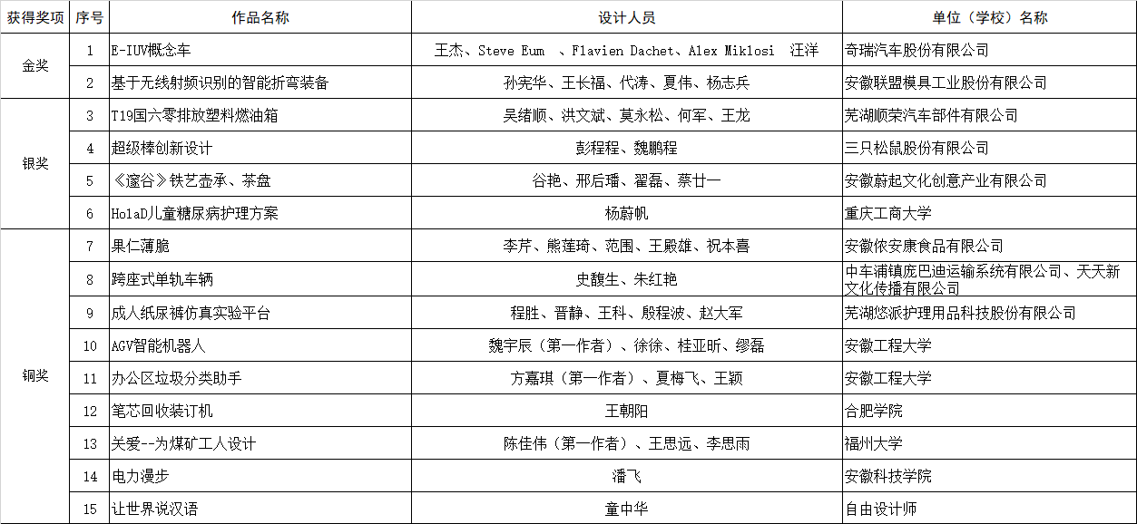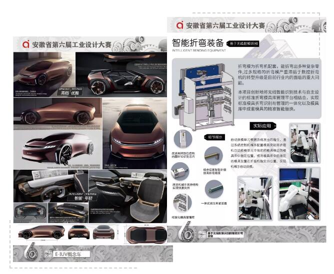 最終,來自奇瑞汽車的E-IUV概念車(概念設計)與安徽聯盟模具工業(yè)有限公司的基于無線射頻識別的智能折彎裝備( 實物產品)榮獲本次大賽金獎,從設計理念、產品外形、先進技術在產品中的應用以及解決行業(yè)痛點等關鍵問題上,以上作品在行業(yè)中均處于領先水平。同時,來自順榮股份、三只松鼠、美的冰箱、中車龐巴迪(蕪湖)、安徽工程大學、安徽工業(yè)大學等企業(yè)、高校投稿作品也在本次大賽中取得了優(yōu)異的成績。