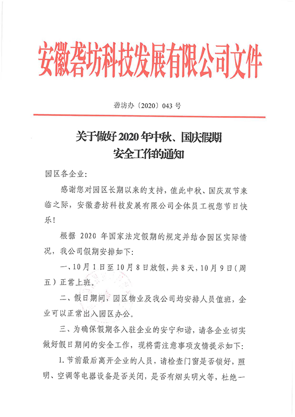 關(guān)于做好2020 年中秋、國慶假期安全工作的通知